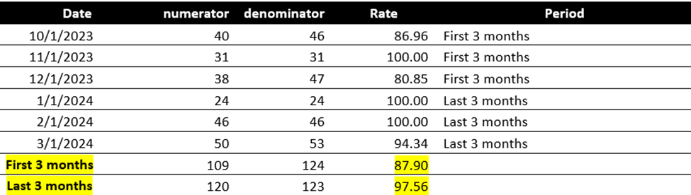 | Performance rates for CCMC for the Project Period October 2023 through March 2024 for the Post-Discharge Follow-Up Appt Measure. |